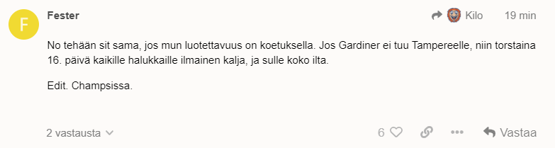 Tuo Gardiner-huhu nyt edelleen elää sen aloittaneen kaverin toimesta tuolla meidän foorumilla, jos JYP ei mitään suurta myyntiä ole aloittamassa niin tuon huhun mukaan ainakin Gardiner silti tällä hetkellä pohtii Ilveksen ja Tapparan väliltä. En tiedä sitten mutta huhuilija on ollut perillä asioista usein.