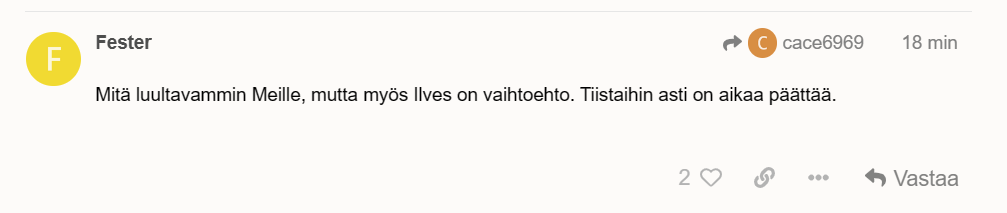 Juuri näin. Ainoa valttikortti Tapparalla voisi olla, niin CHL-finaali. Mutta Ilveksellähän nyt huutavampi tarve tämän tyyppiselle pelaajalle olisi.Joo luulisi ettei kanukilla ole mitään preferenssiä Tampereen seurojen välillä. Ilves voi tarjota isompaa roolia, toivottavasti tarjoaa myös parempaa palkkaa.