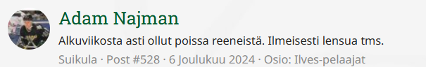 @Suikula :n viesti Najmania koskien ollut välttämättä kuin arvelu siitä, miksi on ollut poissa kokoonpanosta: