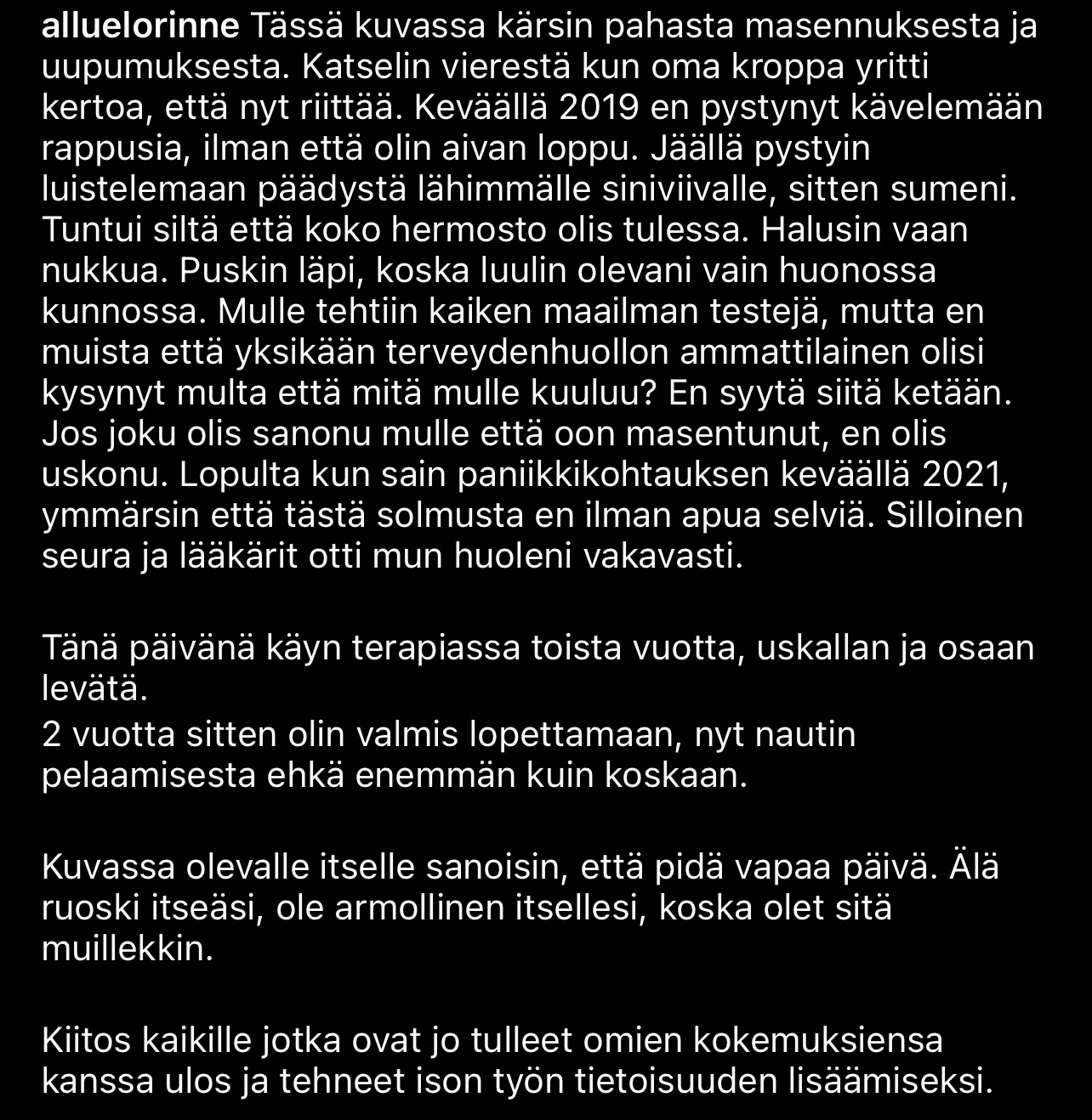 Ja melkein sanoisin että kiekkopiireissä näitä on paljon. On vaan sellasta ”kovien miehien hommaa” ettei näitä tunnusteta.Hyvä muistutus, että kiekkoilijatkin ovat ihmisiä ja voivat kärsiä mm. työuupumuksesta siinä missä muutkin.