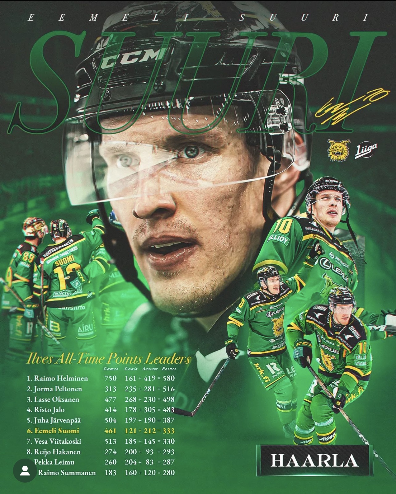Mikäli viime hetken kokoonpanomuutoksia ei tapahdu, nousee Eemeli Suomi tänään kaikkien aikojen runkosarjaotteluissa Ilveksessä sijalle 7 tasoihin Ville Korhosen kanssa. Tämä tarkoittaa siis sitä, että kymmenisen vuotta 2000-luvun eniten runkosarjaotteluita pelanneen Ilveksen valtikka on siirtymässä Kollilta Supille. Kiitos, Kolli, thank you tomcat, mutta mennään eteenpäin.
