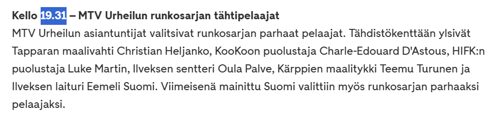 Tai sit ois tullu vielä vähemmän, jos olis pyörittämässä. Palve oli kyllä mies paikallaan omalla tontillaan. Ja eemeli kans mies paikallaan omalla tontillaan.Voi sanoa, että Eemelillä jäi jonkun verran pisteitä matkalla ylivoimalta ihan vaan sen takia koska pelasi siinä neliön keskellä. Toki maaleja siitä räppäsi, mutta tilastollisesti saisi enemmän tehopisteitä jos olisi isommin mukana pyörittämässä ja jakelemassa paikkoja.