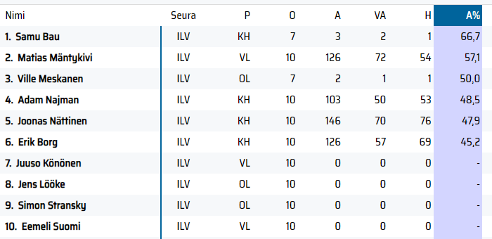 On hyvä huomata, että Borgin aloitusvoitot jakautuvat vähän erikoisesti alueittain. Nimittäin hyökkäysalueella, 38.9 %, ja keskialueella, 43.2 %, hän on Ilveksen keskushyökkääjistä heikoin, mutta puolustusalueella, 50.9 %, toiseksi paras. Ja aloitukset vähemmän yllättävästi painottuneet puolustusalueelle. Toki hyökkäyspäässä pitää pystyä parantamaan, mutta ollut siis tärkeissä puolustusalueen aloituksissa kokonaisprosenttiaan parempi.