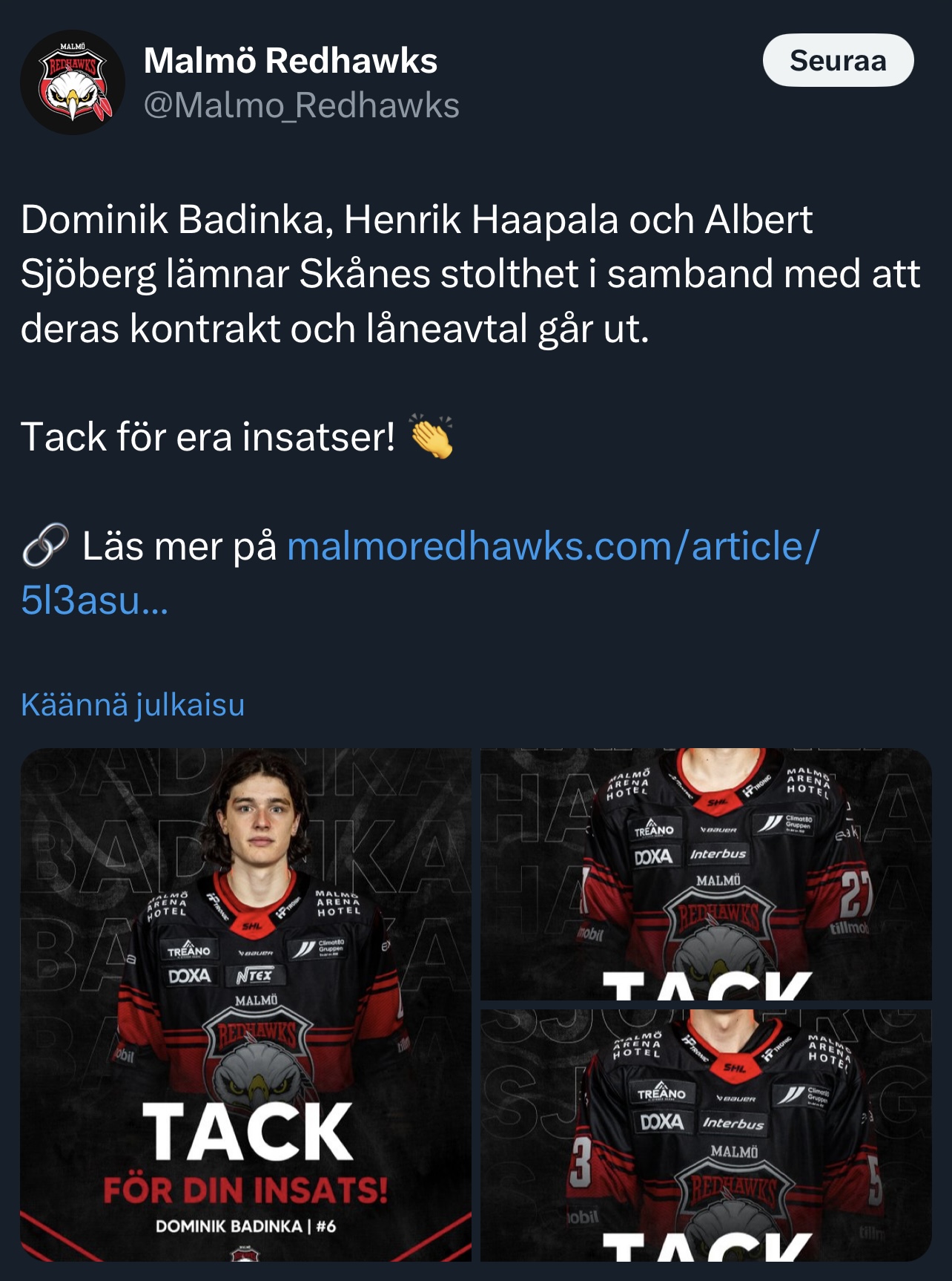Haapala ei ainakaan jatka Malmössä. Oltiinko huhuissa viety HIFK:iin ja Tapparaan? Ilves ei ollut neuvotteluissa mukana?