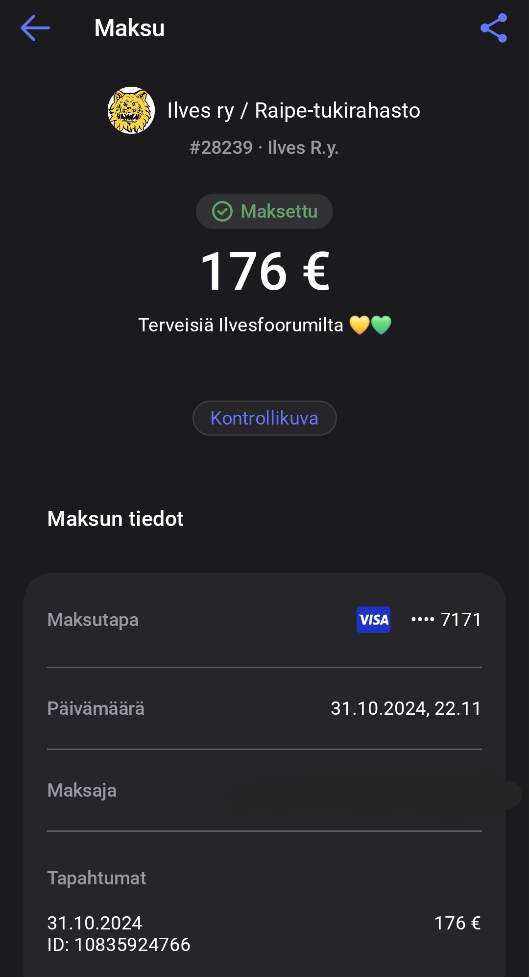 Oman lupaukseni jo lunastin ja kannustan kaikkia osallistumaan oman kykynsä mukaan ja vaikka vain sitten yhdellä Mobilepay-vitosella (tuossa mun kuvakaappauksessa mp:n lyhytnro).