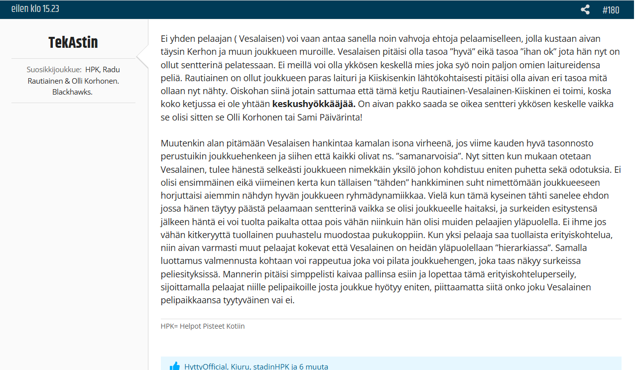 Ihan turha näitä on selitellä kauniimmaksi. Ei yhdessäkään Liigajengissä pitäisi olla tilannetta, jossa laituri määrittelee arvonsa ykkösen sentteriksi etukäteen. Hpk ja Tps vetelee todella isolla riskillä tässä kohtaa. Saarelan nyt vielä jotenkin ymmärtää, mutta että laiskanpulskea Vesalainenkin vielä saa itse määritellä roolinsa ykkösen sentterinä.
