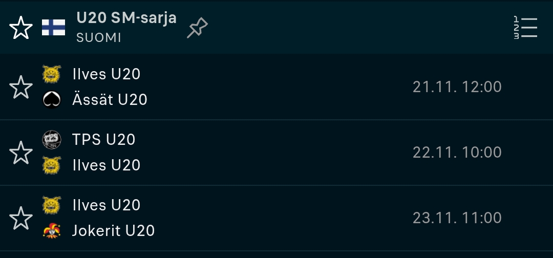 Jep. Vaasassa on viikonlopputurnaus, missä 3 peliä pelaavat: Ilves, Sport, Jokerit, TPS, HPK ja Ässät.Varmaan jääkiekkoliitto. Onkohan nää pelit taas niin et pelataan turnausmuotoisena samalla paikkakunnalla?