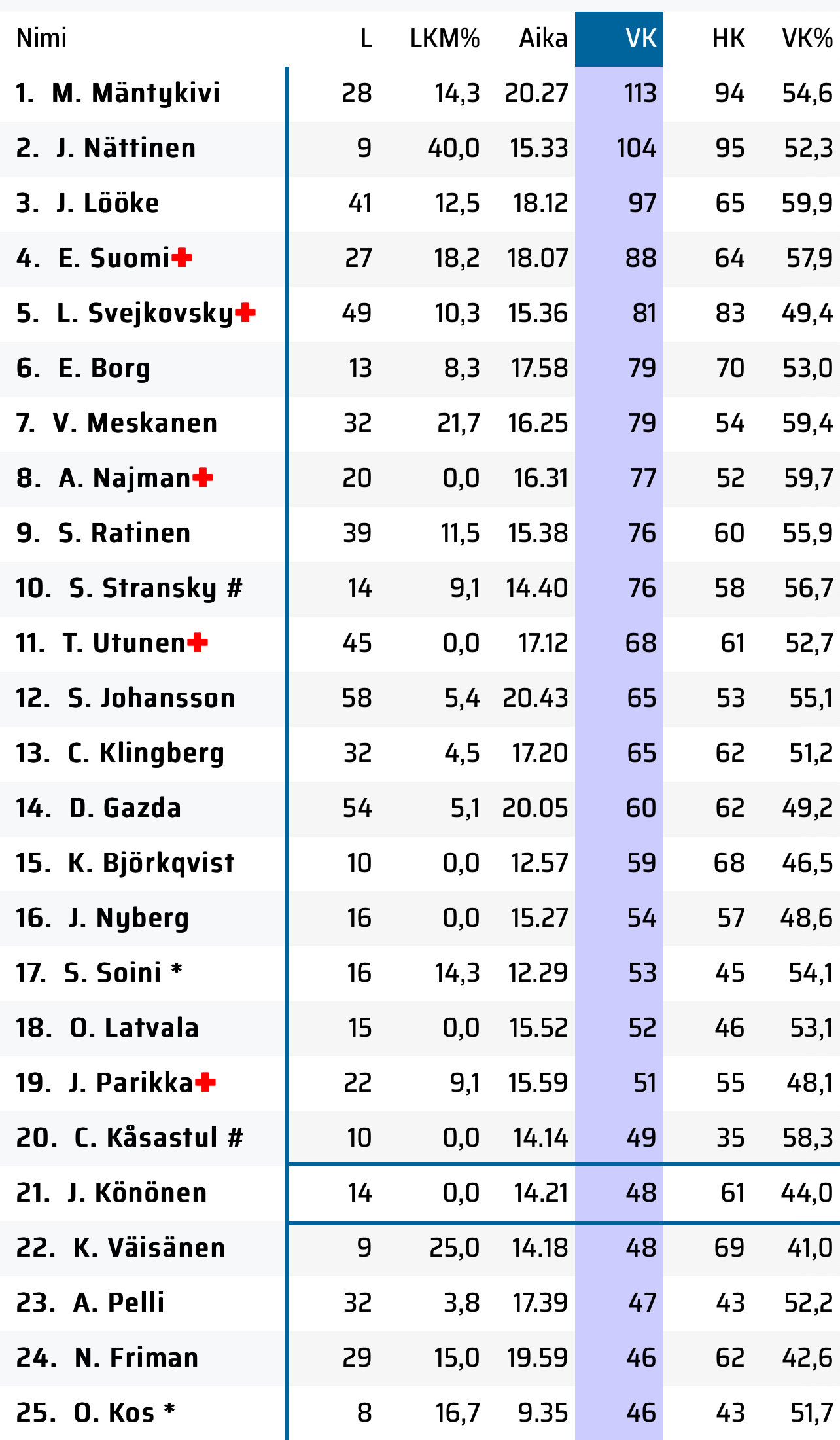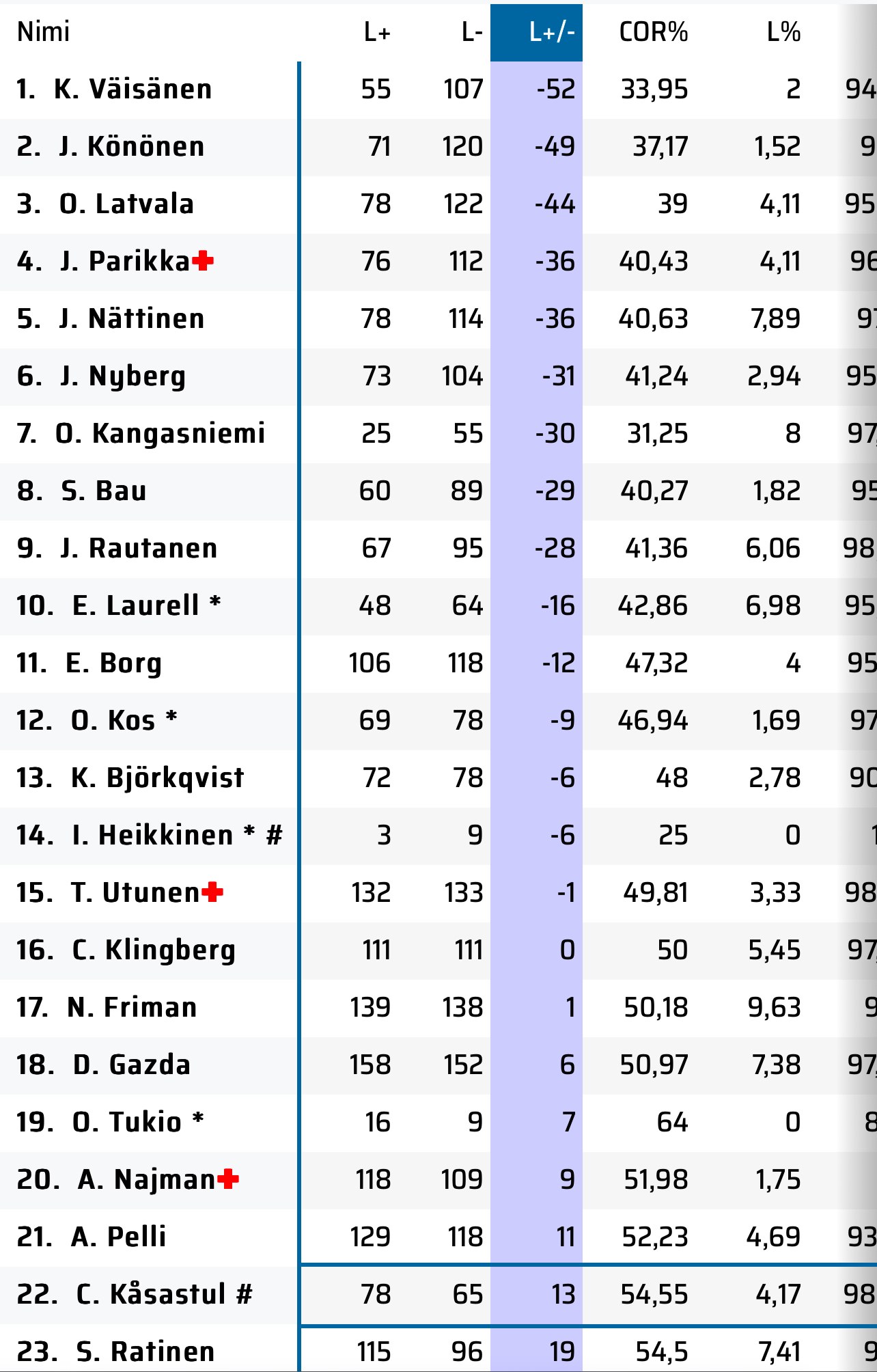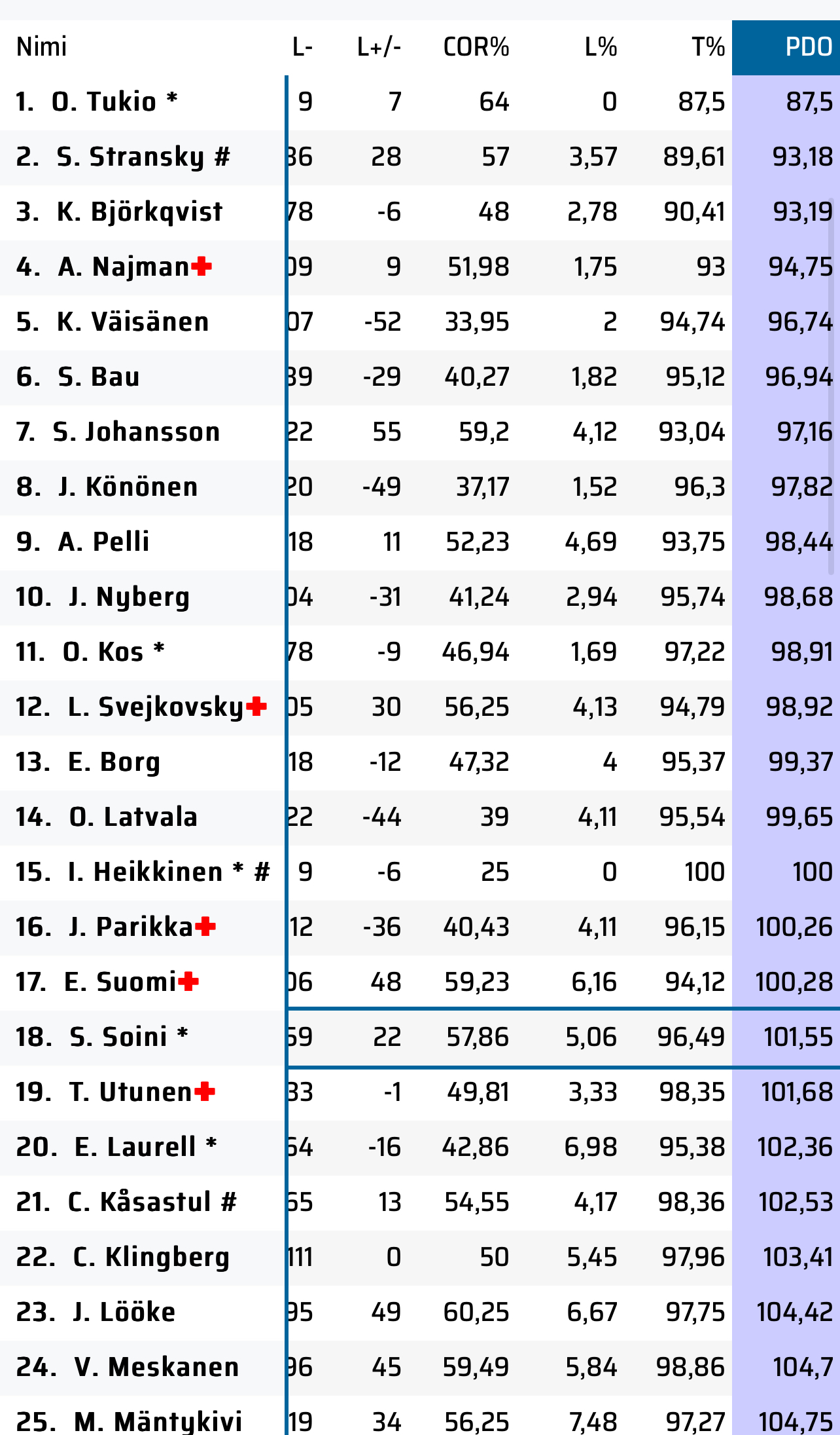 PDO:ssa kun otetaan tuolta pois sellaiset ketkä eivät nyt ole juuri pelanneet niin Könönen on jengin heikoimpia Baun ja Väiskin kanssa.