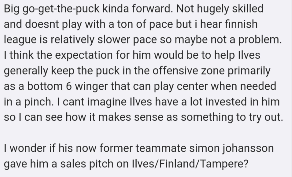 Aloin muistella, että kyllä mulla itsellänikin jotain muutakin oli tuon laidassa pelaamisen tueksi kuin hajamainintoja googlesta. Sitten kaivoin tältä foorumilta viestin, jossa oli kuvat siitä, kun kyselin viime vuonna O'Learyn tullessa Iowa Wildin palstalta, että minkälainen pelaaja on. Vastauksissa oli mm. tämä: