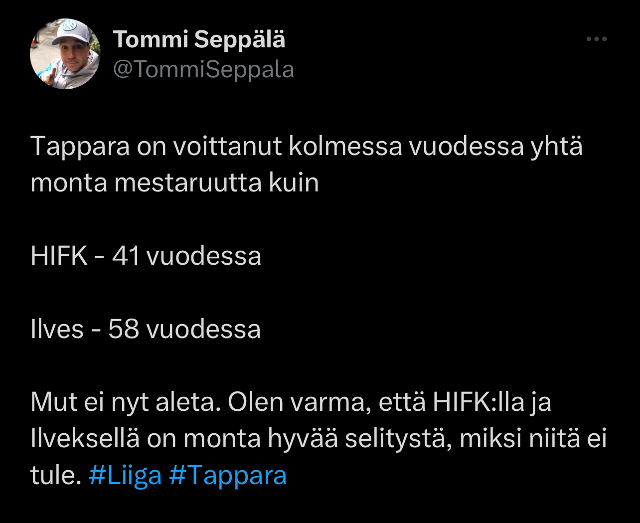 Melko varmasti toivetta. En siis meinaa että Tappara välttämättä ottaa neljättä mestaruutta putkeen, mutta voi olla jopa lähempänä mestaruutta ku tällä kaudella. Ei siellä näytä mitään mukavoitumisia tulleen, ja olihan pleijarit vahva näytös jälleen kerran. Tulevan kauden joukkueen huhuillaan olevan vahvistuva tästä kaudesta.Tosin en sitten tiedä onko tämä enemmän toivetta vai uskoa, mutta oma tuntuma on, että tämä oli Tapparan osalta tässä. Tarkoittaen siis sitä, että ensi kaudella juhlii joku muu kuin Tappara. Tämän ja viime kausien mestaruuksien takuumiehet poistuvat joukkueesta ja Savinainen on taas vuoden vanhempi. Grönnborg sai heti sen mitä tuli hakemaan ja todennäköisesti ajatukset kääntyvät P-Amerikkaan tai takaisin Sveitsiin.