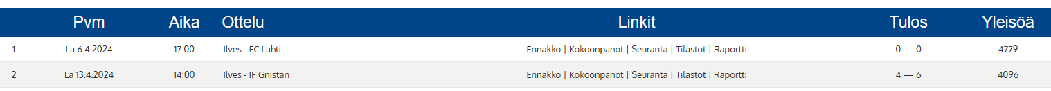 Ymmärsinkö jotain väärin, vai eikö viime kauden molemmat huhtikuun pelit olleet yli 4k?Toivon kyllä, että yllätyn positiivisesti. Mutta viime kaudella mestari-KuPSilla oli lupi vieraana avauspäivänä; siellä oli yleisöä hurjat 3000, alle koko kauden keskiarvon. Sitten tuota keskiarvoa (jotain 3500 luokkaa se oli, tarkkaa en jaksanut etsiä) googlatessa tuli futisforkalta tälläinen lista vastaan: