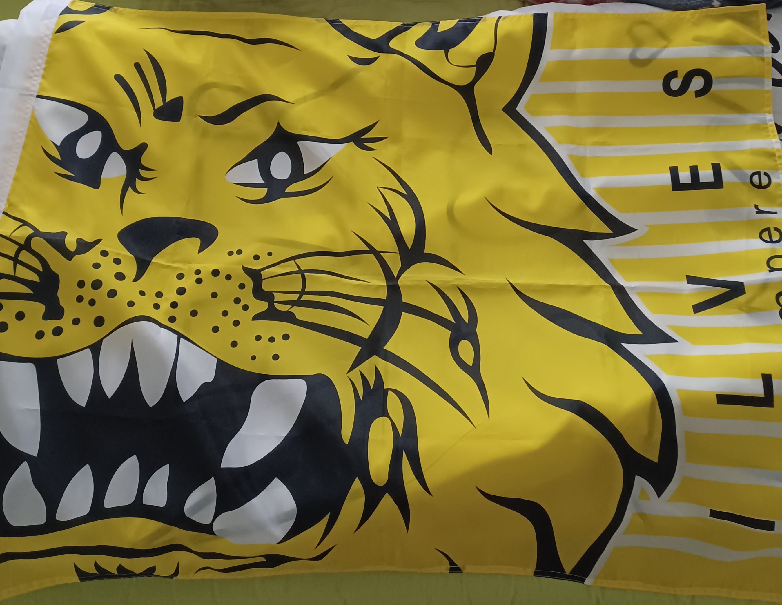 Joskus vuosia sitten oli vielä isompiakin myynnissä ja itseltäkin löytyy sellainen. Ulkomuistista arvioisin kooksi noin 100 x 150 cm. Saattaa olla kyllä vähän pienempikin. Pelkällä keltaisella pohjalla varustetulla lipulla on sen verran kuitenkin ikää, että Ilves-logon ympäriltä puuttuu valkoinen reuna, joka on ollut kiekkopuolella jo useamman vuoden käytössä ja tulee myös jalkapallopuolen logoon brändiuudistuksen mukana.
