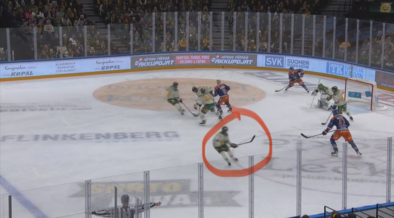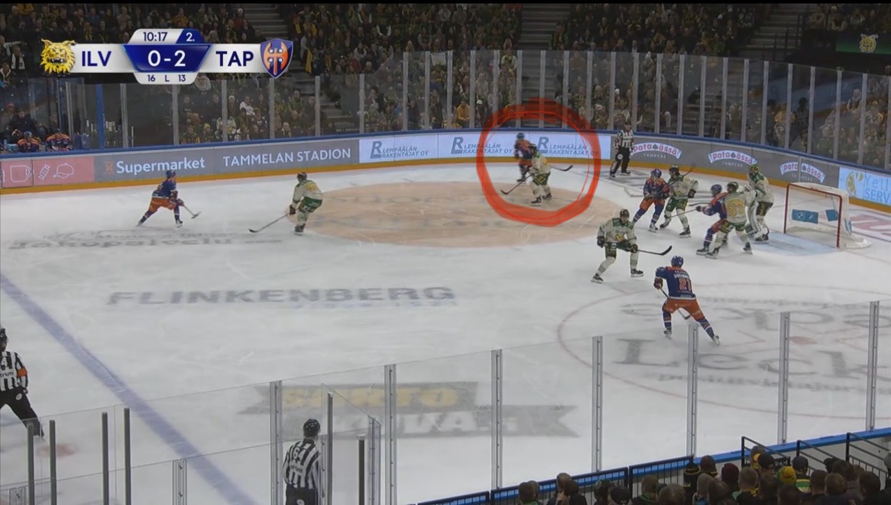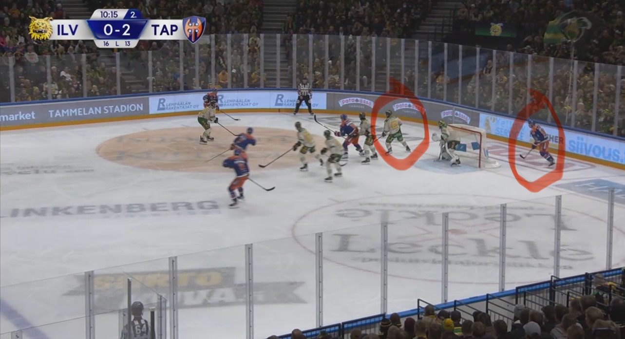 Tässä vielä seisoo hyvin Leskisen rinnalla kun Tappara pyörittää ja liikkuu hyökkäysalueella.