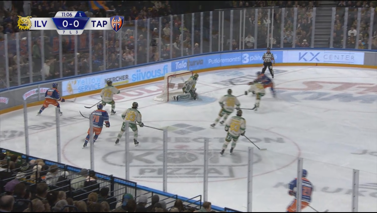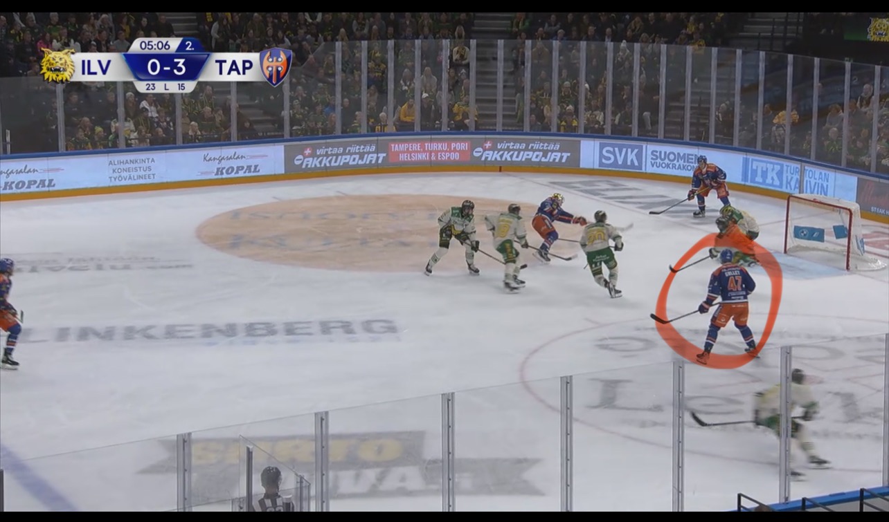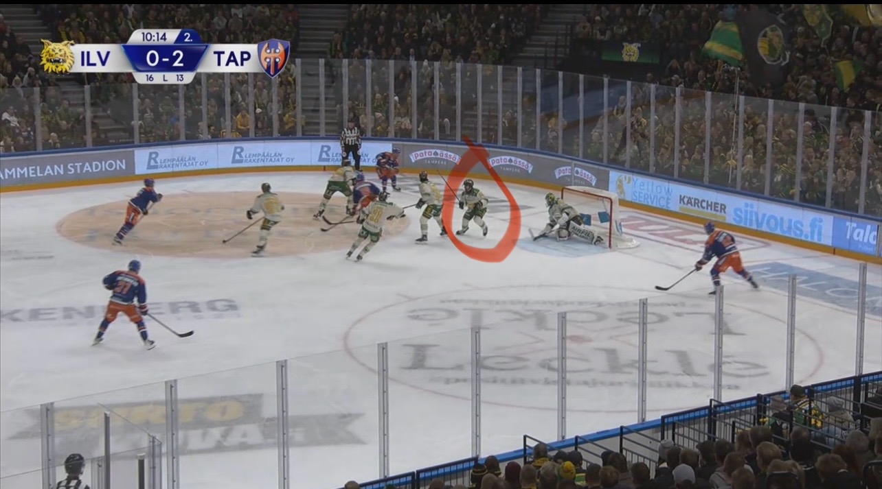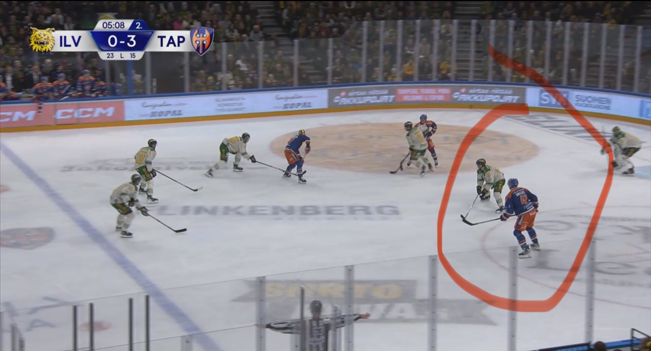 0-4 maalia edelsi parikin ”tuuria” naapurin puolelta. Ilveksellä oli lähellä väärä vaihto ja Kappe ei voinut koskea kiekkoon keskialueella, kun tuli vaihdosta. Teki kuitenkin hyvin duunin ja otti Puhakan kiinni takakarvilla. Tässä vaiheessa Rautanen hyvin katsoi Galletin. Kaikki pitäisi olla kunnossa ja hyökkäys mallia 3vs5.
