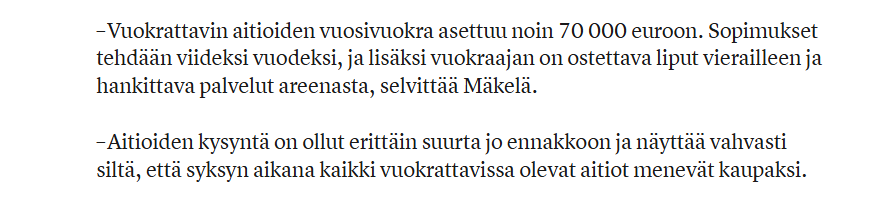 Tappara ja Ilves ovat näistä vuokranneet 20 aitiota - niistä tuskin maksetaan kuitenkaan täyttä rahaa eli 1,4 M€/vuosi (700k/seura/vuosi).