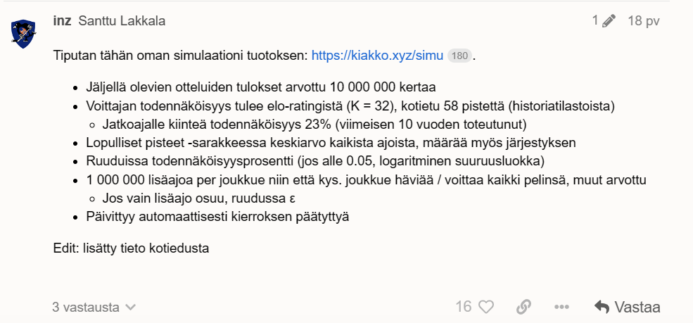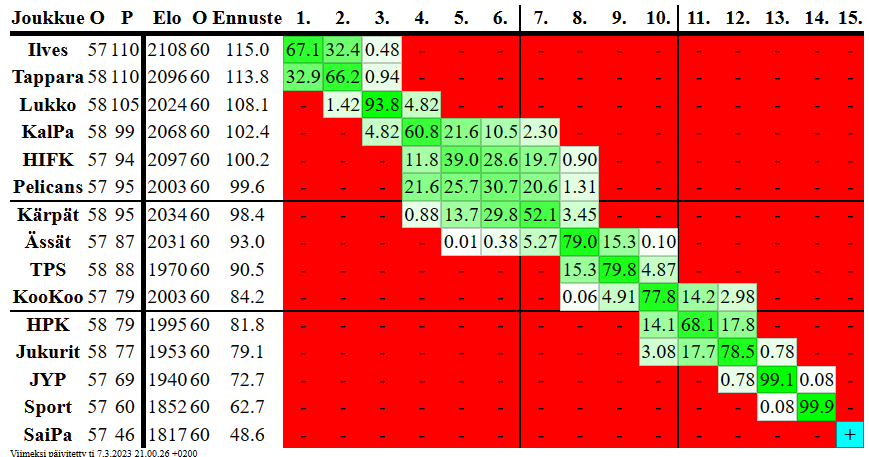 Hahmottelin taas todennäköisyyksiä runkosarjasta, jos sattuu kiinnostamaan. Nämähän menee aina joka kierroksen jälkeen isosti uusiksi...(Ennen eilistä alempana arvioitu todennäköisyys oli n. 49%)
