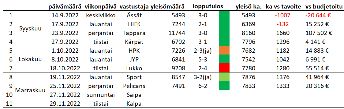 Lopuksi sanon vielä sen verran että kumulatiivisesti ollaan siis yhdeksässä matsissa tuolla 20,5€/katsoja arvotuksella kerätty 253 947€ yli budjetoidun! Splendid!