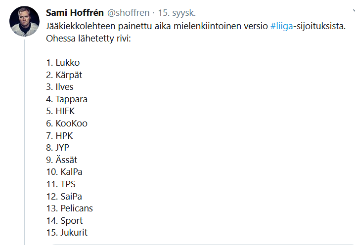 Hauska kyllä katsoa miten surutta Kärpät heitetään ykköseksi. Omasta mielestä heikentynyt viime kaudesta ja pelkästään nimiä katsomalla siellä Lukko ja Tappara tulee olemaan edellä.