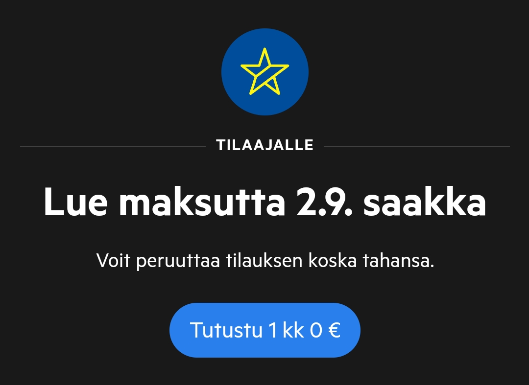 Jep, taitaa tuossa olla tuo "tilaajalle", jotenkin merkillinen, kun kumminkin on tutustumistarjous, mutta yhtäkaikki, löytyi tuo euron tutustumistarjous, pitää ottaa seTälläseltä näyttää minulla vaikka toukokuussa vasta loppui edellinen tilaus.