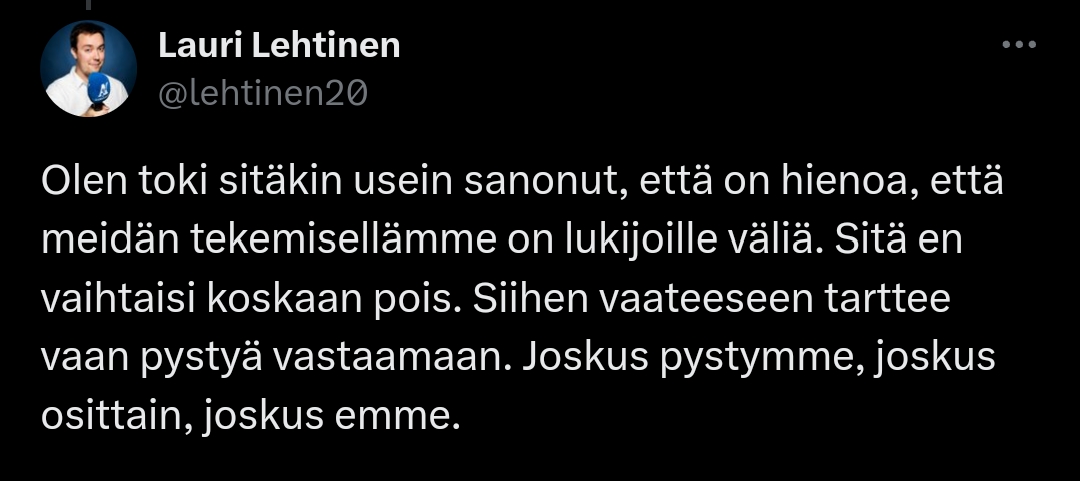 Parempi se on että latelevat kiekkojargonit. En minä Palveen jälkeen halua kuulla keneltäkään että Ilves on vain seura muiden joukossa vaikka tottahan se sinänsä puhuikin.