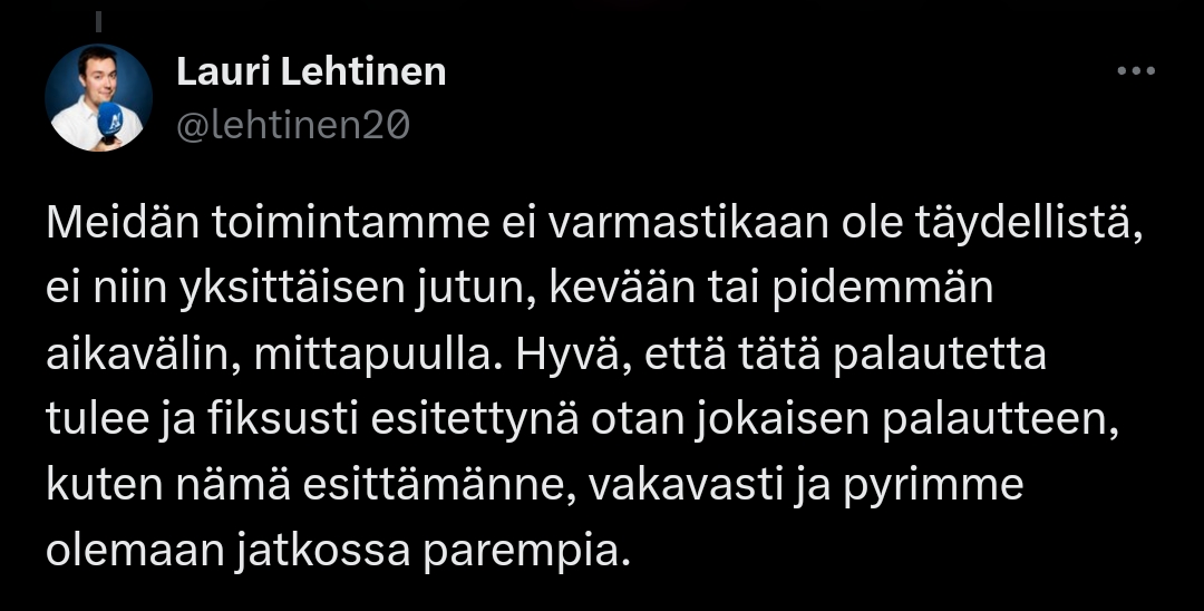 Voit kirjaimellisesti (lue: kuka vaan) kattoa minkä tahansa "tervetuloa"-haastattelun teksteillä eri joukkueen somesta ja päätellä Ilveksen haastisten sisällön. Samaa sielutonta copy-paste kiakkojargonia noi on.