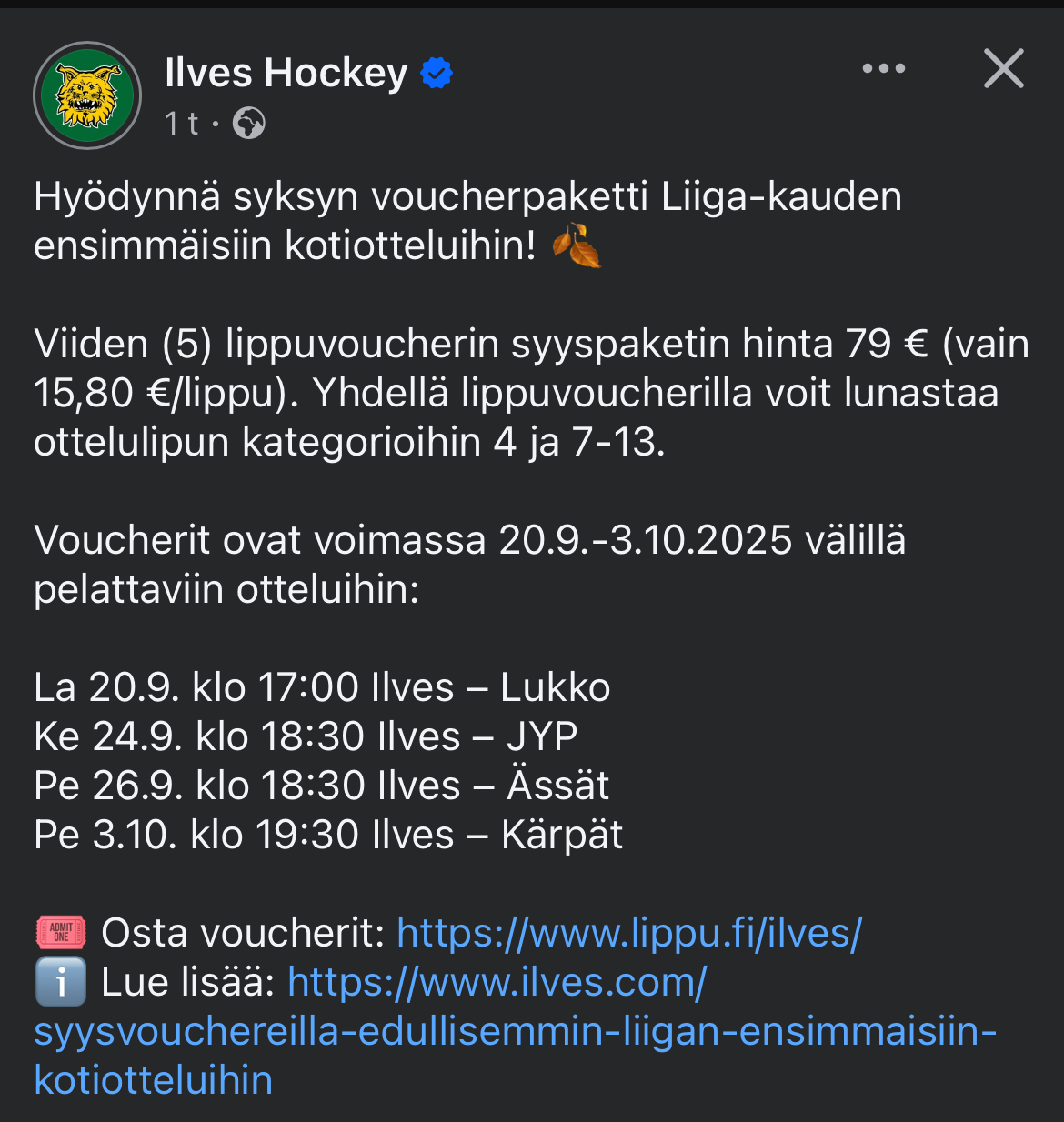 Mitä sitten? Kai nyt yhteen sentään voi vaimon/ystäväoletetun ottaa mukaan?Viisi lippua ja neljä kotipeliäkatso liitettä 14941