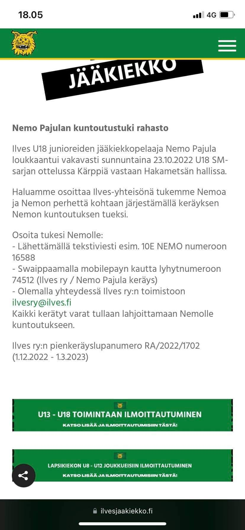 Nyt kolahti. Vähän hävettää meikäläisen arvuuttelut ja hassuttelut Honkalehdosta, kun taustalla olikin näin traaginen juttu. Pakko osallistua keräykseen.Toivottavasti nyt jokainen tajusi mitä olen ajanut takaa tolla ottelulla..olen pojan tuntenut ihan pienestä pitäen niin ajattelin että sen minkä pystyn asiaan vaikuttamaan niin teen kunnolla..harmillista lahjakas ja tervepäinen nuori mies ja oli Ilveksen B ihan ylivoimainen pakkikin..Onneksi pääsee tiputtamaan aloitus kiekon kyseisessä ottelussa…