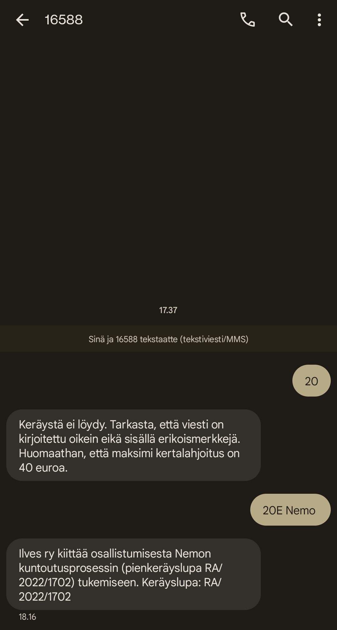 Miten sait tekstiviestillä laitettua. Tuli edelleen se paluuviesti, että keräystä ei löydy?
