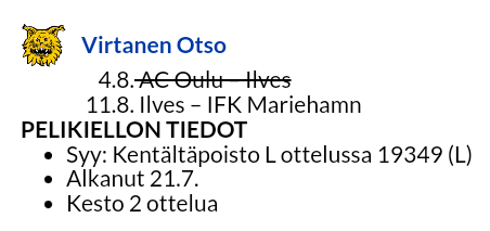 Ja taidat olla oikeassa. Eikö Virtanen ole pelikiellossa.