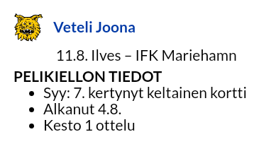 Virtasen lisäksi myös Joona Vetelin korttitili tuli täyteen Oulussa ja hän huilaa MIFK-ottelun.