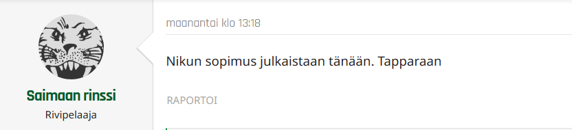 Ja kai tässä voisi olla kyse siitä EFM mainitsemasta vihjeestä numero 2?Saimaan rinssi tiesi Nikunkin. Seura oli väärä, mutta Tampereelle tuli samana päivänä. Sellainen ihan decent, 9+ -tason, huhu oli.
