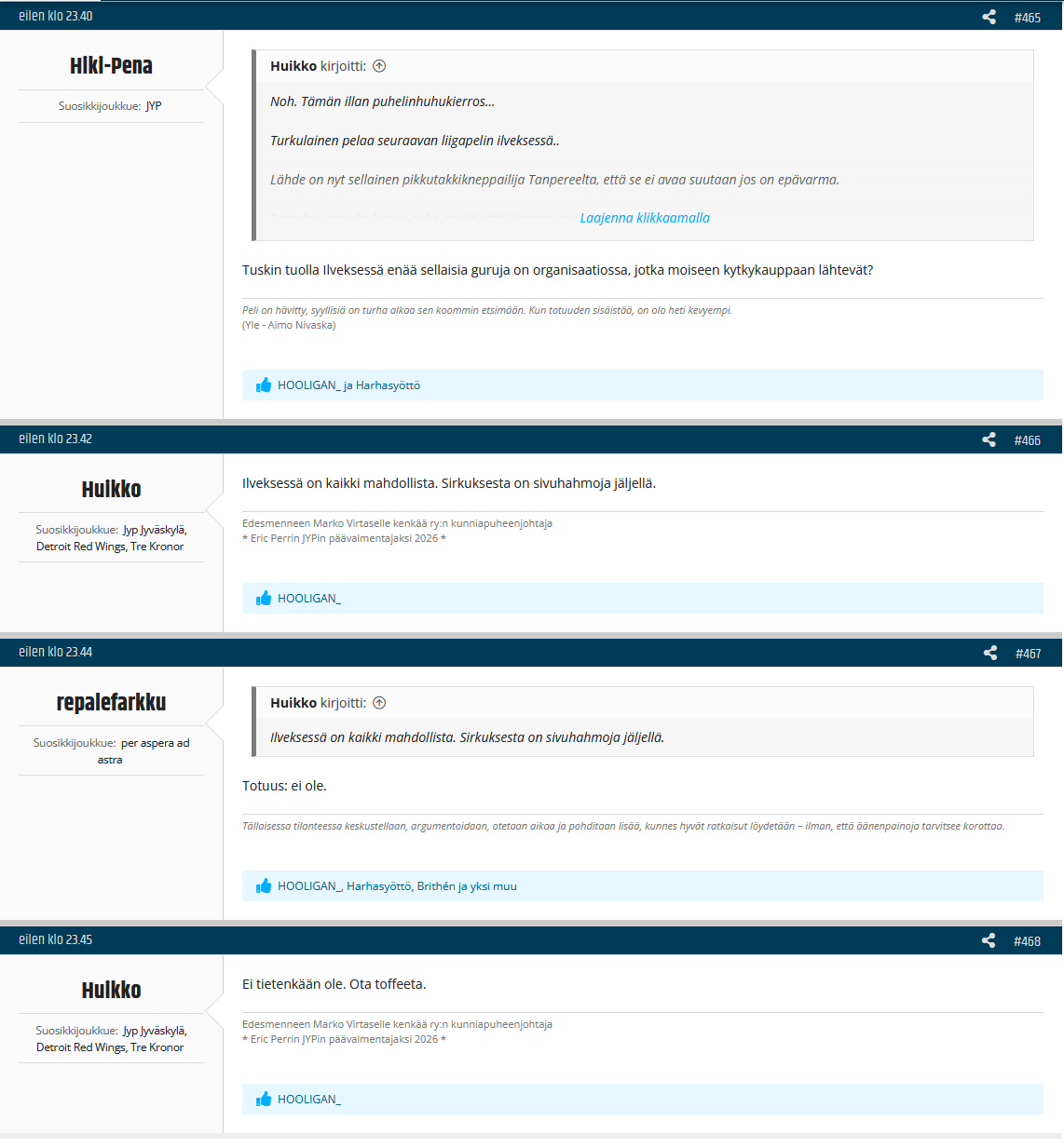 Sen kyllä melkein pystyy päättelemään tuostakin jo. En vaan keksi kuka voisi vanhasta jääkiekkotoiminnasta olla se jäänyt. Jansson ja Lasse nyt jäänyt mutta epäilen niitä isosti.Käsittääkseni tuo Hulkko ei osu huhuillaan edes ladon seinään.
