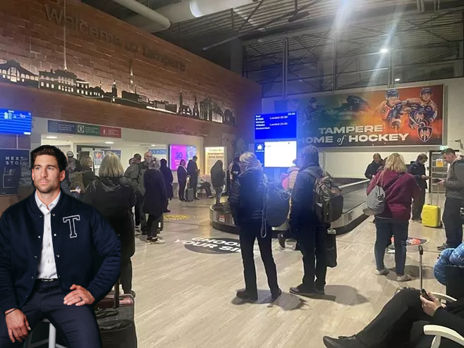 Livekuvaa Tampere-Pirkkalan lentoaseman laukkujonosta. Joku pelimiehen näköinen kiinnitti huomioni. Onko tää se J.T. jota meille huhutaan?