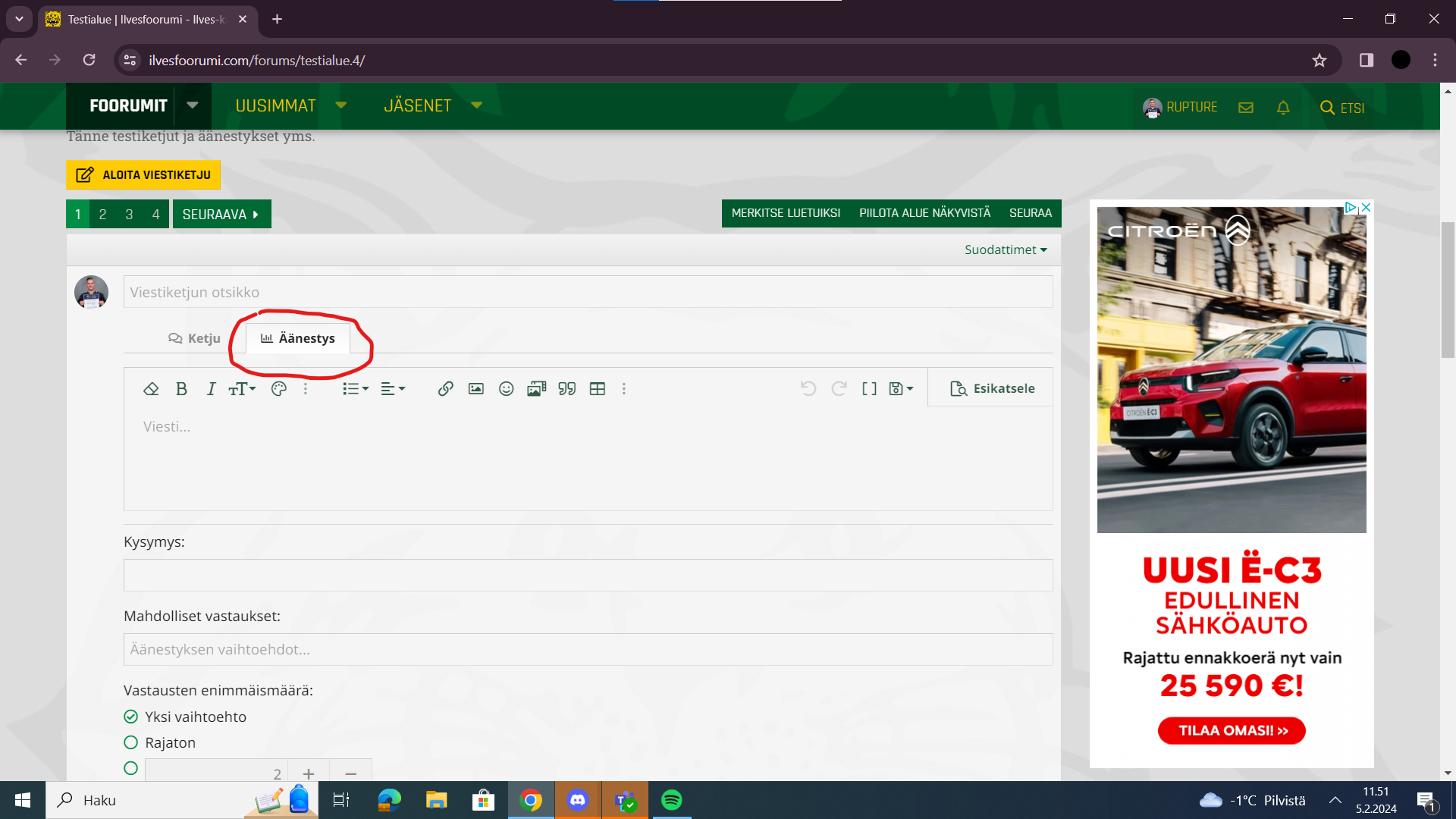 Kun avaa uutta ketjua, niin koneella näkymän pitäisi olla tällainen. On vaihtoehto, että avaako uuden ketjun vai äänestyksen. En ole varma, saako tätä hoidettua puhelimella. En ainakaan äkkiseltä bongannut sitä.