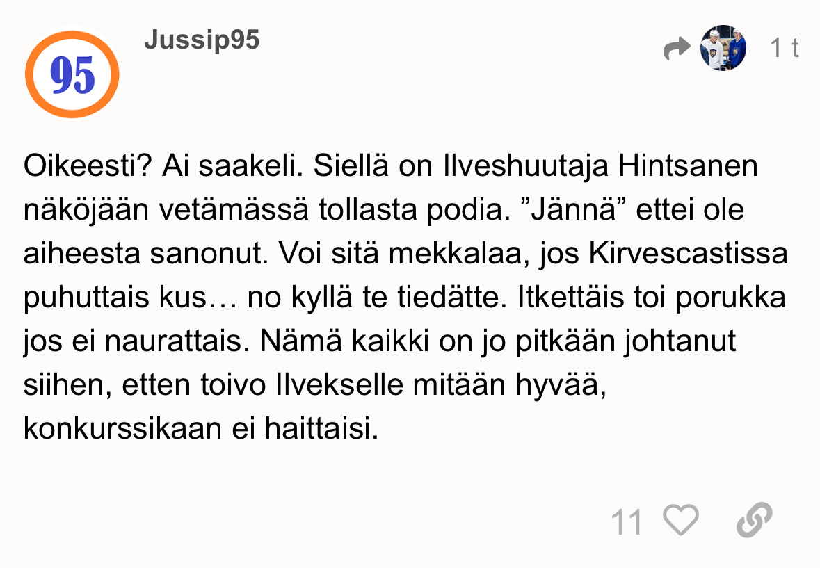 Niin ne ihan tosissaan kuvittelee, että yhtäkään Ilvesläistä saatika Osastolaista kiinnostais hevon helvettiä mitä ne meistä puhuis omassa podcastissaan?