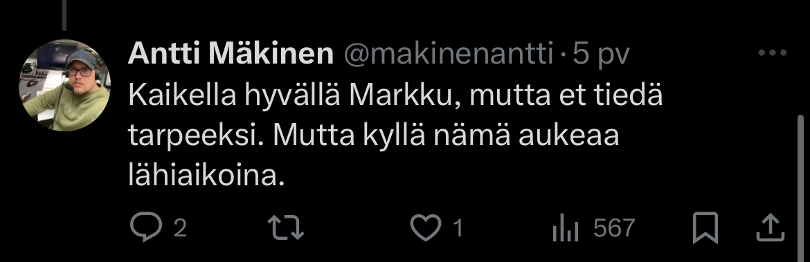 Onko Antti ennen kirjoitellut noin että ei syystä x kerro tarkemmin? Livenä useita kertoja nähnyt kaverin ja jutellut, vaikea ainakaan sen perusteella uskoa, että yhtäkkiä päästään keksisi mitään taikka kirjoittelisi someen semmoista mikä ei ole totta.