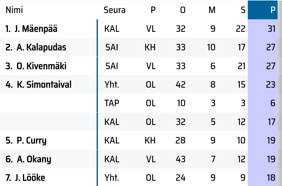 Ensi kaudelle pitääkin tulla sitten uusia vastuunkantajia. 3/5 noista lähtee, onneksi se paras pistemies pysyy.Tässä on edellisen kolmen kauden Ilveksen pudotuspelien pistepörssin top5.