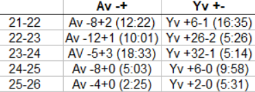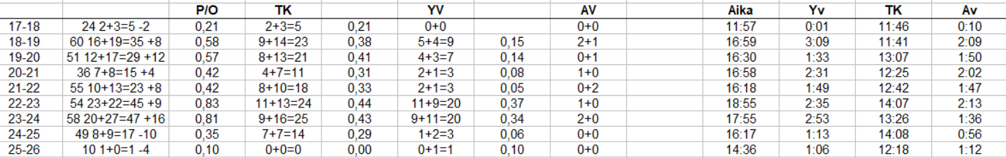 Sulkeissa oleva lukema tarkoittaa sitä, että kuinka tiheään tahtiin av:ssa on tullut miinusmerkkejä tai yv:ssa plusmerkkejä. Av:ssa luonnollisesti korkea luku indikoi kovaa suorittamista ja ylivoimassa päinvastoin.