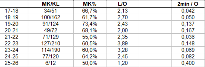 Ylivoimallakin Joona on jäänyt lähinnä stunttirooliin ja pelannut sitä vasta 9.eniten hyökkääjistä. Malmön yv on kuitenkin toiminut mukavasti prosentin ollessa 30,0%. Viime kaudella Malmö oli siinäkin sarjan huonoin lukemalla 17,8%.