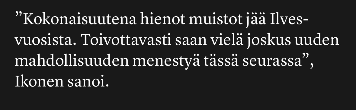 Kyllähän tässä kaiken kaikkiaan melko selvää on se, että Ilveksessä käyty junioripolku on tänne hakiessa rasite. Siitä huolimatta on myös syytä muistaa, ettei tämä nyt välttämättä ole sellainen lintukoto, jonne kaikki edes haluaisivat palata. Kyllä noi pelaajien perheille kohdistetut tappouhkaukset ja muu kusipäinen käytös oikeasti myös vaikuttaa aika paljon siihen fiilikseen, mikä täältä lähteneille pelaajille on seurasta jäänyt.