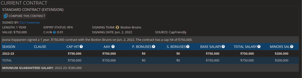 Juu, jossa näkyy että palkka 200kusd. Ihmettelinkin että mistä tuo 285 lukema on saatu. Capfriendly itsellä käytössä.Täältähän näitä näkee.