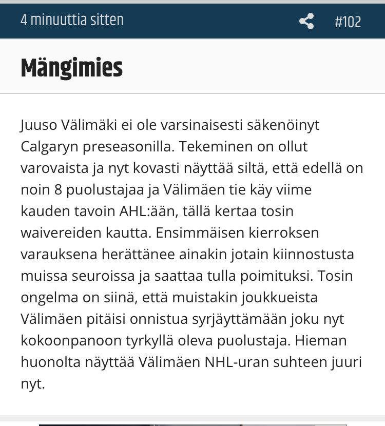 Eipä oikeastaan mitään uutta,sama tilanne oli viime kaudella.Kilpailu on kova ja tarjolla useampi vaihtoehto siihen viimeiselle pakintontille niin usein se menee perusvarmalle fyysiselle puolustajalle. Ei taida lukeutua valmentajan suosikkipelaajiin. Sutter Calgaryn peräsimessä on aika vanhan liiton mies, voitti Kingsissä stanley cupit aika ei niin kauniilla, mutta tehokkaalla kiekolla. Samaa aika simppeliä kiekkoa nytkin pyrkii Calgary pelaamaan eikä taida Juuso paljon päästä vahvuuksiaan hyödyntämään. Jos waivereihin joutuu joku melko varmasti miehen nappaa. Todistihan jo muutama vuosi sitten pienellä ilves-visiitillään olevansa huippupuolustaja Eurooppaan.