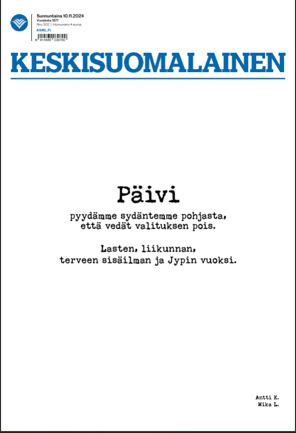 Sanomalehti Keskisuomalaisen etusivu tänään. @Reijo , tuleeko mieleen ketä ovat nuo allekirjoittajat?