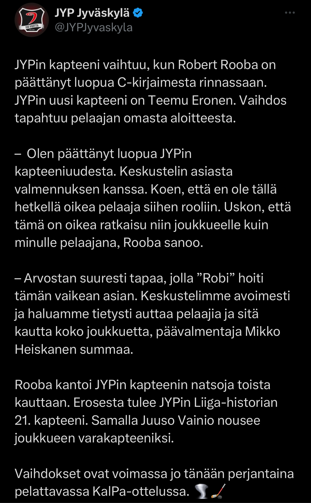 (Vähintään yksi) Kivitalo siis huomenna JYPin voitolle kun saapuvat Liigan virallisen Punaisen ristin vieraiksi.