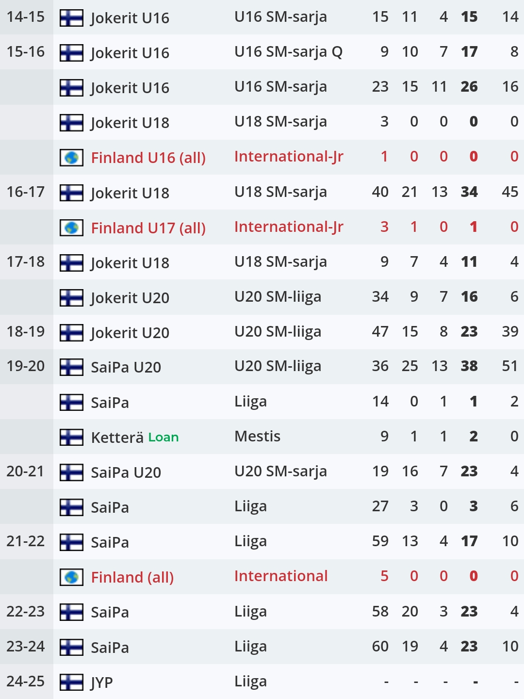 Ja niin pitkälle kun EP näyttää niin tasan kerran on kerännyt syöttöjä enemmän kun maaleja. Kausi 19-20 14 ottelua 0+1