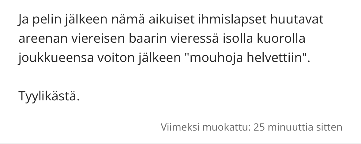 Ylipäätään kyseessä on hyvin ruma muisto menneisyydestä, johon kukaan tuolla ei ole voinut vaikuttaa. Syytön jokainen on esi-isiensä toimiin. Tuollaista historian likapyykin tuulettelua vuonna 2025 en pysty ymmärtää, vaikka ei mun mieleni siitä osumaa paikalla ottanut. Vähän ku menis Saksaan kannattajamatkalle muistutellen, että on muuten jokunen täällä natsien jälkeläinen. Teoriassa joo, historiaa tifo ei muuta mihkään suuntaan, mutta tyhmää se on, yksinkertaista.