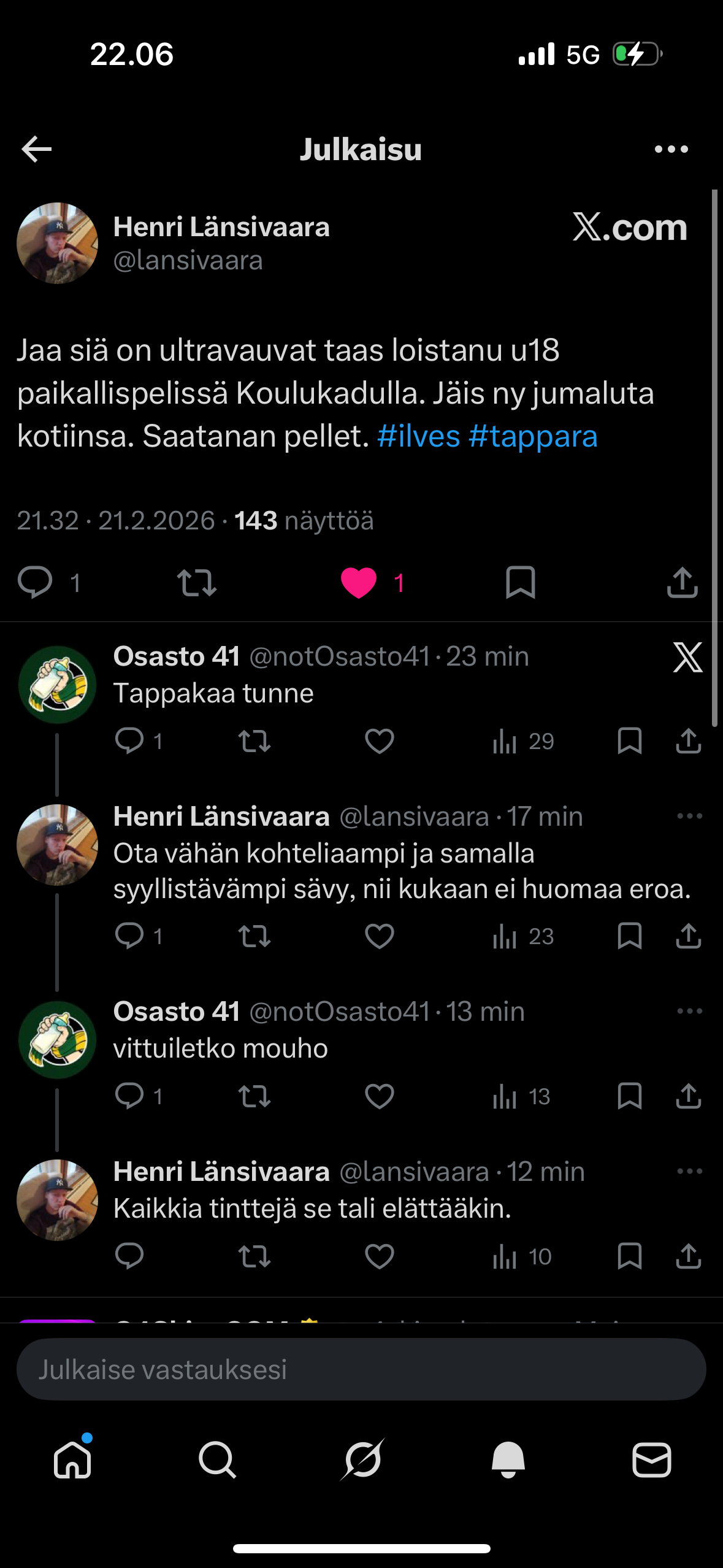 No en nyt hirveästi olisi moksiskaan, jos humalaiset huutelee. Moni tuolta saa kuunnella samaa muutama vuosi vanhempana, jos aikoo ammattilaiseksi."Vähän typerää". Järjestä itse tapahtuma ja käytä siihen paljon vapaa-aikaasi, mene kuuntelemaan kun lapsellesi huudetaan huoraa ja tapa ittes kehotuksia ja mieti sen jälkeen onko tuo "vähän typerää" vai ihan vitullista spedeilyä.