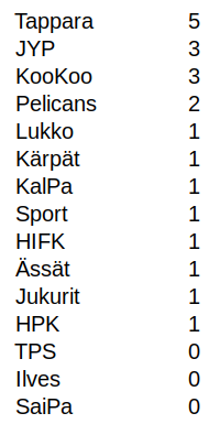 Kaikki pitää toki voittaa, mutta kyllä melkein KooKoon ottaisin kaikista mieluiten. Hpk voi myös nousta vielä top-6, Jypin en usko enää sieltä kampeavan.