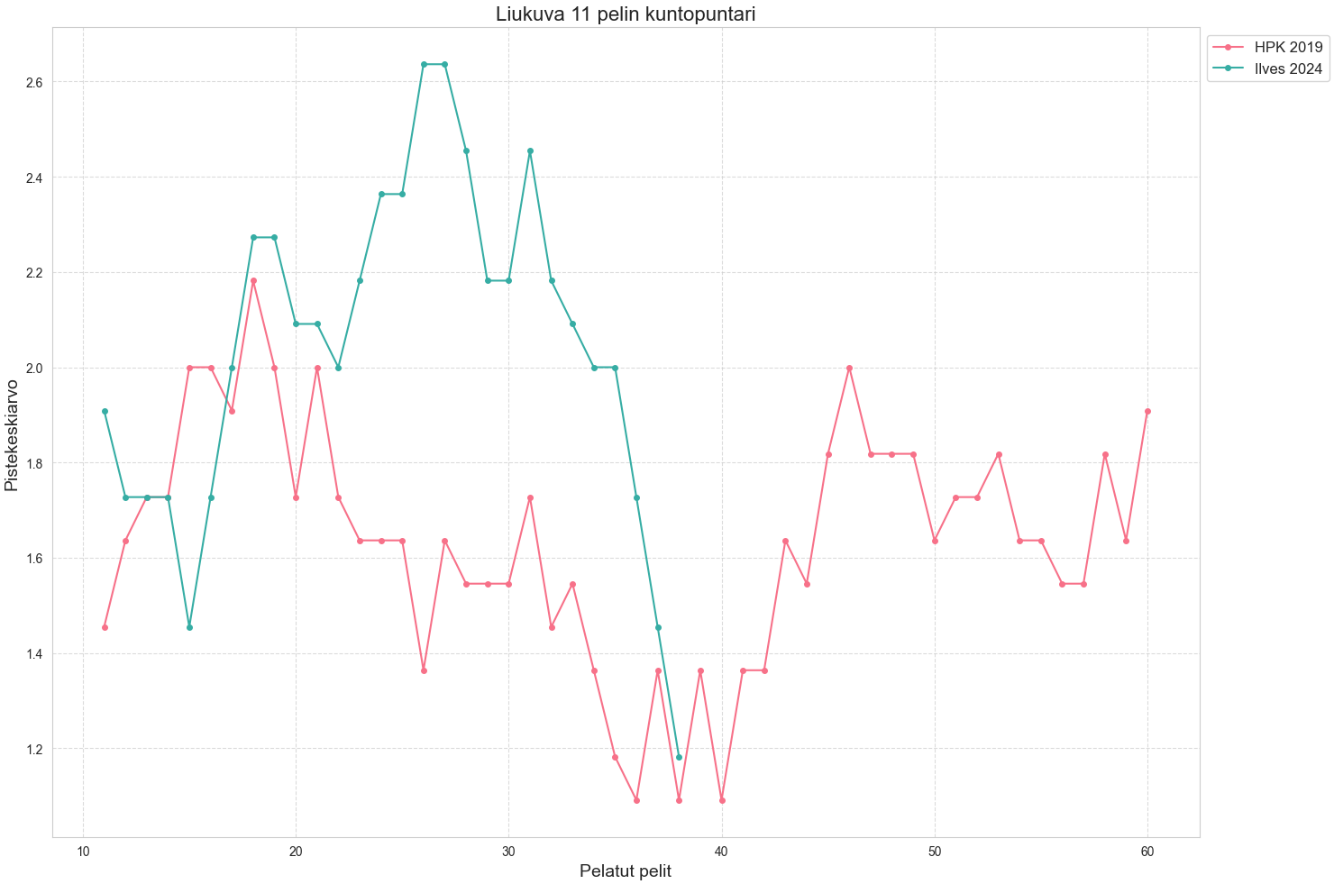 Aika samaltahan nuo käyrät näyttää. Itsekin tuollaisia eilen vähän tein, mutta kuukausitasolla ja kaikista Pendon jengeistä ja samankaltaiset käyrät piirtyi joka kaudesta. Vähän hidas startti, josta käännytään nousuun. Kauden puolivälin jälkeen droppia josta taas sitten kevättä kohti noustaan. Ihan juuri ennen kevättä vielä uusi droppi/slumppi josta sitten kohti kevättä nousu. Osuisi jotenkin yksiin myös @Rautakorven haamu n paljon puhumien reenijaksojen kanssa.Koska viestihistoriasi perusteella otat kuitenkin kantaa tuohon, ettei 10 ottelun kuntopuntari tarkoita samaa kuin 11 ottelun, alla on vielä HPK:n koko kauden sekä Ilveksen tämän kauden liukuma 11 pelin kuntopuntarilla.