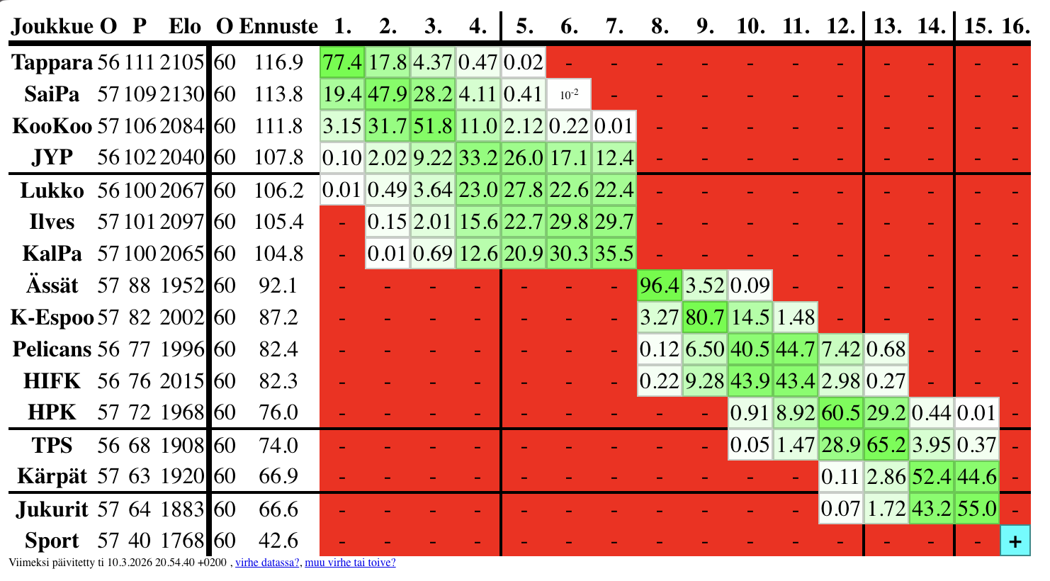 Jypin tarvitsee menettää vain 1 piste niin top 4 on omissa käsissä. Ilveksellä on parempi tiebreak ja Ilves kohtaa molemmat Jypin sekä Lukon vielä.jaaha, jyp ja lukko kun huomenna häviäis, niin top 4 täysin omissa käsissä.